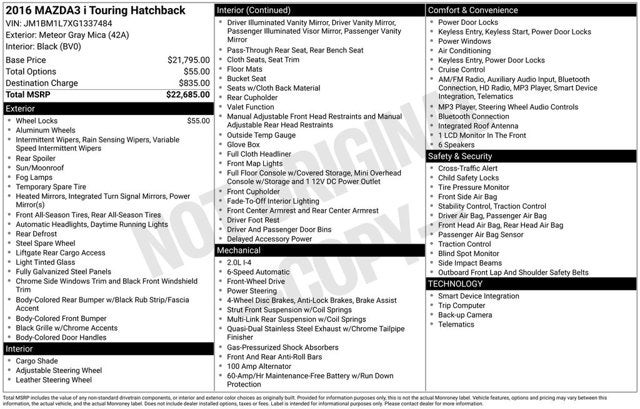 2016 Mazda Mazda3 Meteor Gray Mica i Touring FWD SKYACTIV®-G 2.0L 4-Cylinder DOHC 16V 6-Speed Automatic