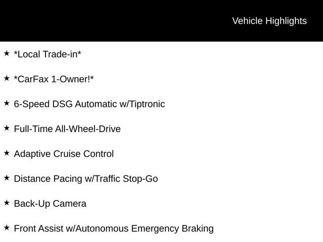 *Local Trade-in*, *CarFax 1-Owner!*, 6-Speed DSG Automatic w/Tiptronic, Full-Time All-Wheel-Drive, Adaptive Cruise Control, Distance Pacing w/Traffic Stop-Go, Back-Up Camera, Front Assist w/Autonomous Emergency Braking, Heated Top Sport Front Seats, Lane Departure Warning System, Keyless Entry w/ Push Button Start, Bluetooth® w/ streaming audio, Smartphone Intergration, Apple Carplay / Android Auto, SiriusXM Radio, Real-Time Traffic Display, Sport Leather/Piano Black Steering Wheel, Navigation System. CARFAX One-Owner.