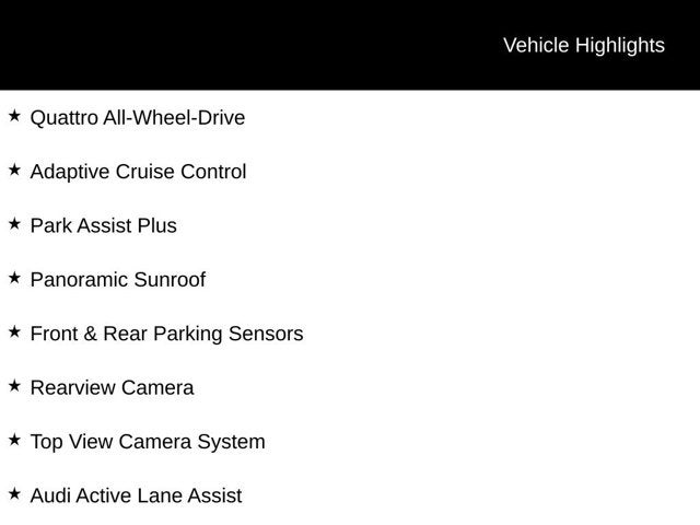 Low Miles!, Premium Plus Package, Executive Package, Navigation Package, Convenience Package, Towing Package, LED Interior Lighting Plus Pkg, 20 Wheel Package, Quattro All-Wheel-Drive, Adaptive Cruise Control, Park Assist Plus, Panoramic Sunroof, Front & Rear Parking Sensors, Rearview Camera, Top View Camera System, Audi Active Lane Assist, Audi MMI Navigation Plus, Bang & Olufsen 3D Sound System, Apple Carplay & Android Auto, Audi Connect, Bluetooth® w/ Streaming Audio, SiriusXM Radio, Heated Steering Wheel, Heated & Cooled Front Seats, Heated Rear Seats, Passive Keyless Entry, Push-Button Start, Power Liftgate, Trailer Hitch. CARFAX One-Owner.