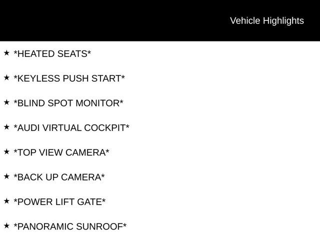 *NAVIGATION*, *PREMIUM PLUS PKG*, *S-LINE*, *QUATTRO*, *AWD*, *AUDI SIDE ASSIST*, *AUDI ADVANCED KEY*, *AUDI CONNECT*, *ACTIVE LANE ASSIST*, *CONVENIENCE PKG*, *ADAPTIVE CRUISE CONTROL*, *AUX*, *USB*, *SATELLITE RADIO*, *SMART PHONE INTERFACE*, *Bluetooth®*, *HEATED SEATS*, *KEYLESS PUSH START*, *BLIND SPOT MONITOR*, *AUDI VIRTUAL COCKPIT*, *TOP VIEW CAMERA*, *BACK UP CAMERA*, *POWER LIFT GATE*, *PANORAMIC SUNROOF*, *BANG & OLUFSEN*, *LED HEADLIGHTS*, APPLE CAR PLAY, *AUDI PRE SENSE REAR*, *AUDI DRIVE SELECT*, SUPER LOW MILES!!!, *STEERING WHEEL CONTROLS*, AUDI BEAM RINGS, HEATED STEERING WHEEL, S LINE INTERIOR PACKAGE, *HEATED STEERING WHEEL*, 2 Rear USB Charge Ports, Adaptive Cruise Control, Alarm System w/Motion Sensor, Audi Active Lane Assist, Audi Advanced Key, Audi Connect PLUS, Audi Phone Box, Audi Side Assist w/Pre Sense Rear, Audi Virtual Cockpit Plus, Auto-Dimming Exterior Mirrors w/Memory, Bang & Olufsen Sound System w/3D Sound, Brushed Aluminum Inlays, Convenience Package, Driver Seat Memory, Hands-On Detection Steering Wheel, Leather/Dinamica Seating Surfaces, Leatherette Covered Center Console & Door Armrests, MMI Navigation Plus, Navigation Package, Navigation System, Parking System Plus (Front/Rear Acoustic Sensors), Power Folding Exterior Mirrors, Premium Plus, S-Line Interior Package, SiriusXM w/360L, Stainless Steel Pedal Caps, Top View Camera System, Traffic Jam Assist, Wheels: 19 5-Spoke-Cavo Design Bi-Color Finish. CARFAX One-Owner.