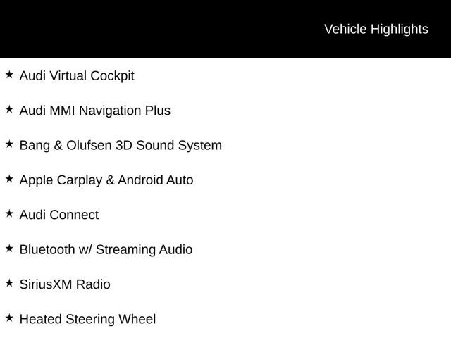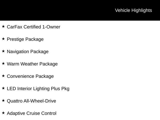 CarFax Certified 1-Owner, Prestige Package, Navigation Package, Warm Weather Package, Convenience Package, LED Interior Lighting Plus Pkg, Quattro All-Wheel-Drive, Adaptive Cruise Control, Park Assist, Heads-Up Display, Panoramic Sunroof, Heated Auto-Dimming Mirrors, Front & Rear Parking Sensors, Top View Camera System, Audi Active Lane Assist, Audi Side Assist Blind Spot Monitor, Audi Virtual Cockpit, Audi MMI Navigation Plus, Bang & Olufsen 3D Sound System, Apple Carplay & Android Auto, Audi Connect, Bluetooth® w/ Streaming Audio, SiriusXM Radio, Heated Steering Wheel, Heated & Cooled Front Seats, Heated Rear Seats, Audi Beam - Ring Projection Lights, Digital Matrix Headlights, Push-Button Start, Power Liftgate. CARFAX One-Owner.