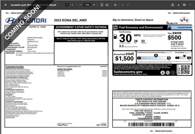 2023 Hyundai Kona Cactus Fern SEL AWD 2.0L I4 DOHC Dual CVVT CVT