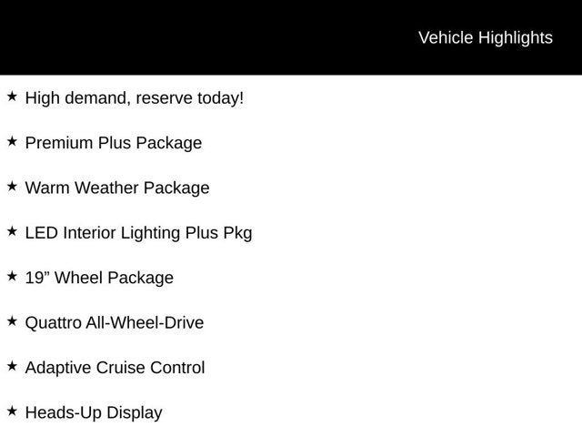 High demand, reserve today!, Premium Plus Package, Warm Weather Package, LED Interior Lighting Plus Pkg, 19 Wheel Package, Quattro All-Wheel-Drive, Adaptive Cruise Control, Heads-Up Display, Panoramic Sunroof, Heated Auto-Dimming Mirrors, Front & Rear Parking Sensors, Top View Camera System, Audi Side Assist Blind Spot Monitor, Audi Virtual Cockpit, Audi MMI Navigation Plus, Bang & Olufsen 3D Sound System, Apple Carplay & Android Auto, Audi Connect, SiriusXM Radio, Heated Steering Wheel, Heated & Cooled Front Seats, Heated Rear Seats, Power Liftgate, Bang & Olufsen Front Headrest Speakers, Black Warm Weather Package, Manual Rear Side Window Sunshades, Stone Gray Birch Linear Natural Wood Inlays, Ventilated Front Sport Seats. CARFAX One-Owner.