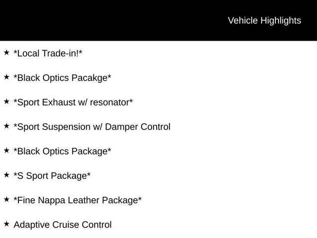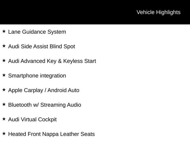 *Local Trade-in!*, *Black Optics Pacakge*, *Sport Exhaust w/ resonator*, *Sport Suspension w/ Damper Control, *Black Optics Package*, *S Sport Package*, *Fine Nappa Leather Package*, Adaptive Cruise Control, Lane Guidance System, Audi Side Assist Blind Spot, Audi Advanced Key & Keyless Start, Smartphone integration, Apple Carplay / Android Auto, Bluetooth® w/ Streaming Audio, Audi Virtual Cockpit, Heated Front Nappa Leather Seats, Heated Exterior Mirrors, Panoramic Sunroof, Park Assist, Lane Departure Warning, Red Brake Calipers, 19 Wheels, Automatic Highbeams, Adaptive Cruise Assist w/Lane Guidance, Alarm System w/Motion Sensor, Audi Advanced Key, Audi Side Assist w/Rear Cross Traffic Assist, Auto-Dimming Interior Mirror w/Compass, Auto-Dimming Power Folding Exterior Mirrors, Black Optic Package, Convenience Package, Fine Nappa Leather Package, Fine Nappa Leather Seating Surfaces, Memory for Driver's Seat, Premium Plus Package, Red Brake Calipers, S Sport Package, SiriusXM w/360L, Sport Suspension w/Damper Control, Wheels: 19 5-Double-Spoke-Edge Design, Wireless Phone Charging Pad.