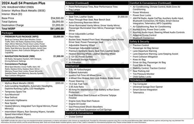2024 Audi S4 Mythos Black Metallic 3.0T Premium Plus quattro quattro 3.0L TFSI V6 DOHC 8-Speed Automatic