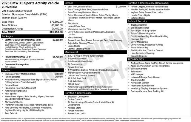 2025 BMW X5 Skyscraper Gray Metallic xDrive50e AWD 3.0L I6 DOHC 24V 8-Speed Automatic Sport
